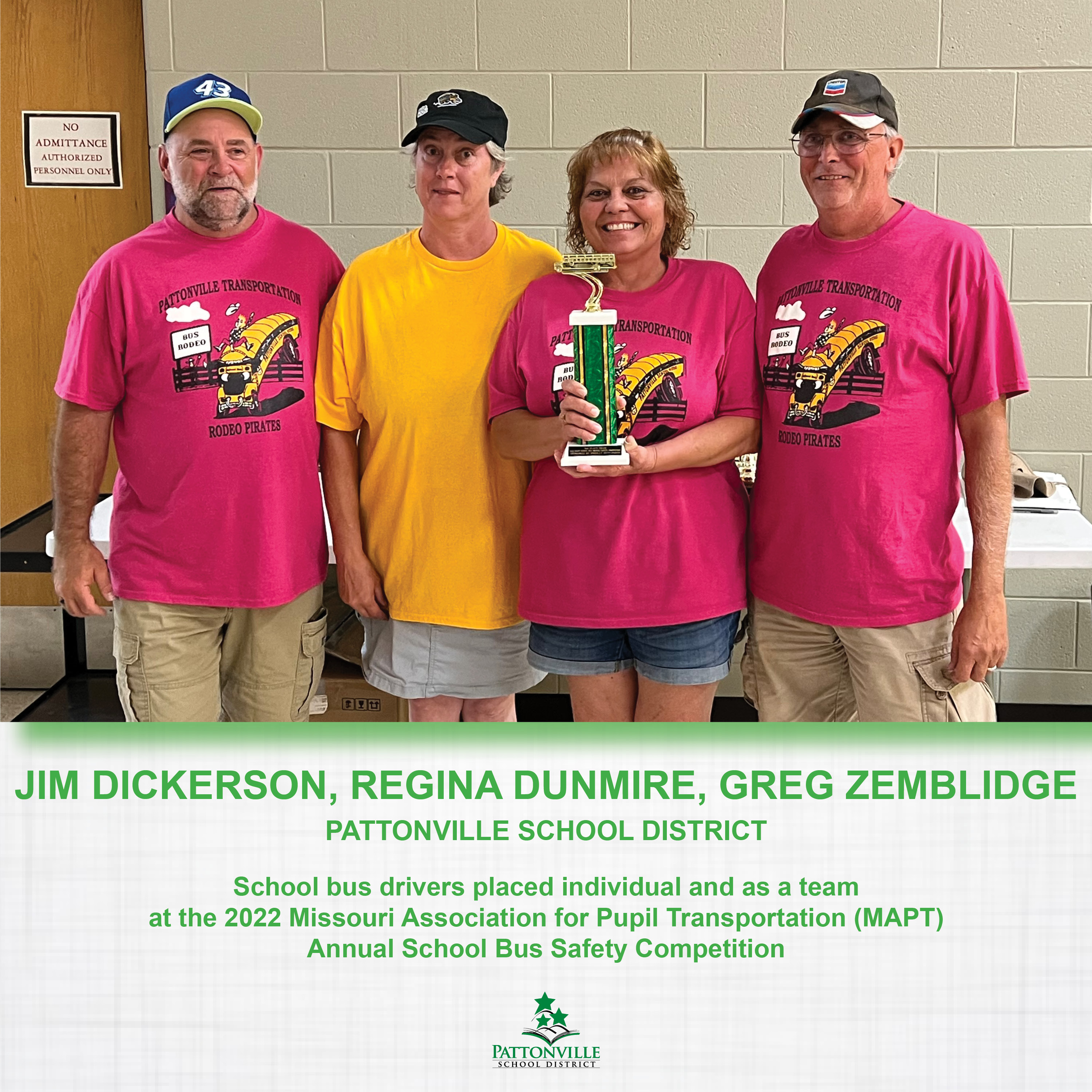 Bus driver Greg Zemblidge won the 2022 Missouri Association for Pupil Transportation (MAPT) Annual School Bus Safety Competition. This is the first time a Pattonville School District driver has won the event and the second consecutive state championship for Zemblidge (2019). Zemblidge will represent Missouri at the 2023 School Bus Driver International Safety Competition. There were no international competitions held in 2020 to 2022.