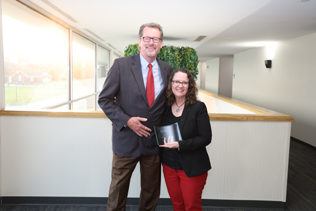 David Luther, executive director of the Missouri School Public Relations Association, presents the Distinguished Service Award to Mickey Schoonover during the May 10 Pattonville school board meeting.